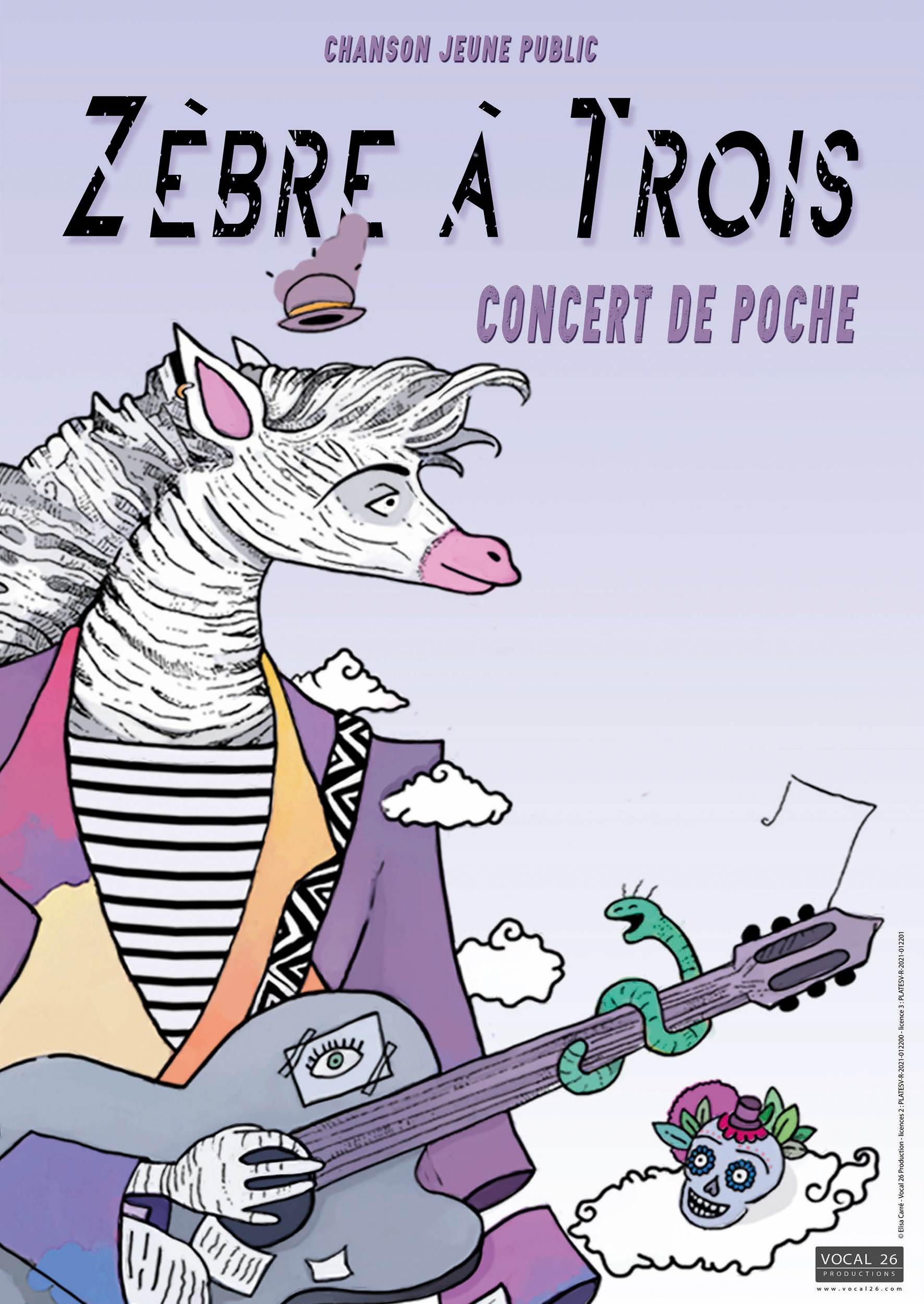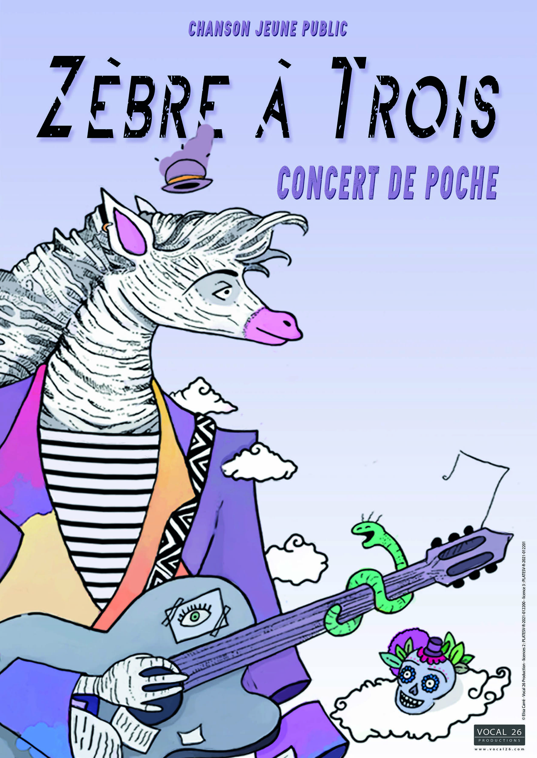 Ce drôle de Zèbre se hisse, en solo, sur un petit plateau en bois et nous entraine, le temps de quelques mélodies dans son univers poétique et théâtral. Les personnages des chansons s’invitent à la fête ; Jo le squelette, Marvin l’épouvantail, Lazard le lézard pour former une joyeuse bande. Un concert où les billes et les cartes Pokemon se mélangent à la poésie, aux rires et à l’irrésistible envie de taper dans les mains.
